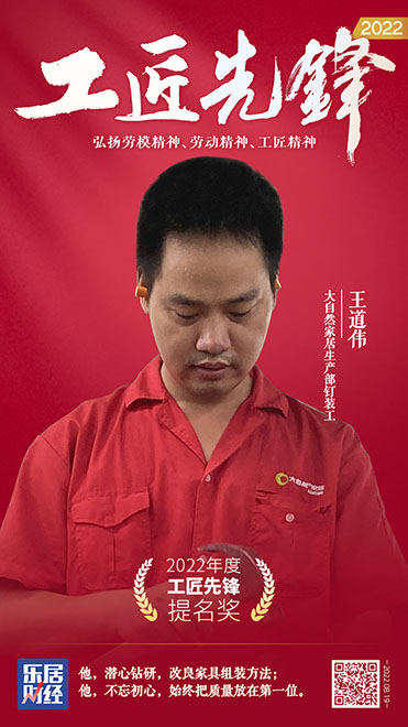 “2022工匠先鋒提名獎”也在現(xiàn)場揭曉,大自然家居生產(chǎn)部釘裝工王道偉獲得該榮譽。時代發(fā)展,需要大國工匠;邁向新征程,需要大力弘揚工匠精神。